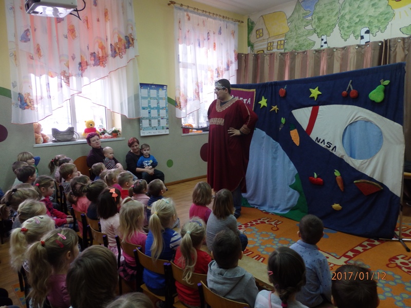 Dnia 12.01.2017r gościliśmy w naszym przedszkolu aktorów ze studia artystycznego „Akada”, którzy przedstawili przedszkolakom teatrzyk pt. „Planeta Samozdrowie i misja Generała Osiłka”.