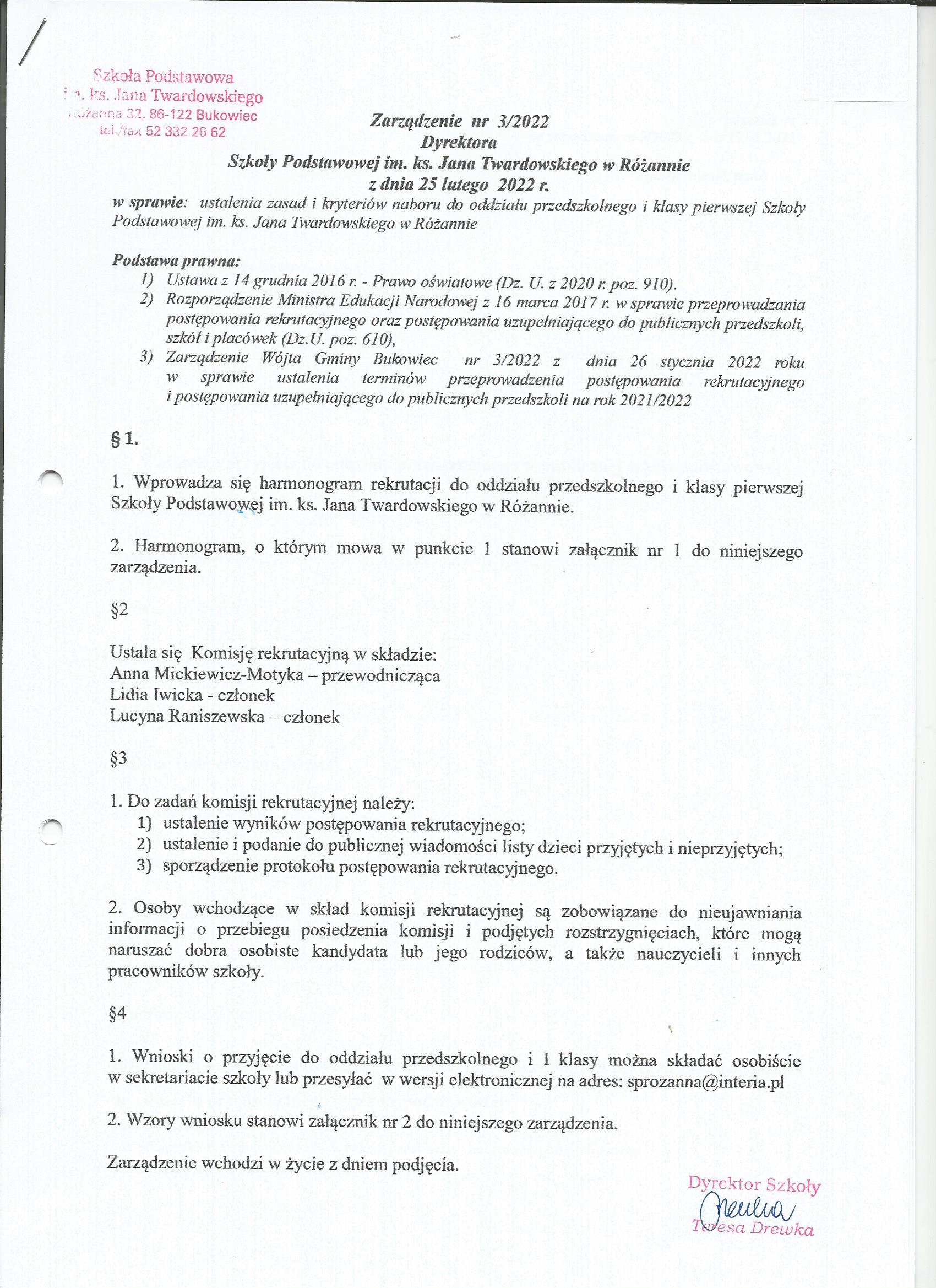 Zarządzenie nr 3/2022 w sprawie zasad naboru do oddziału przedszkolnego
