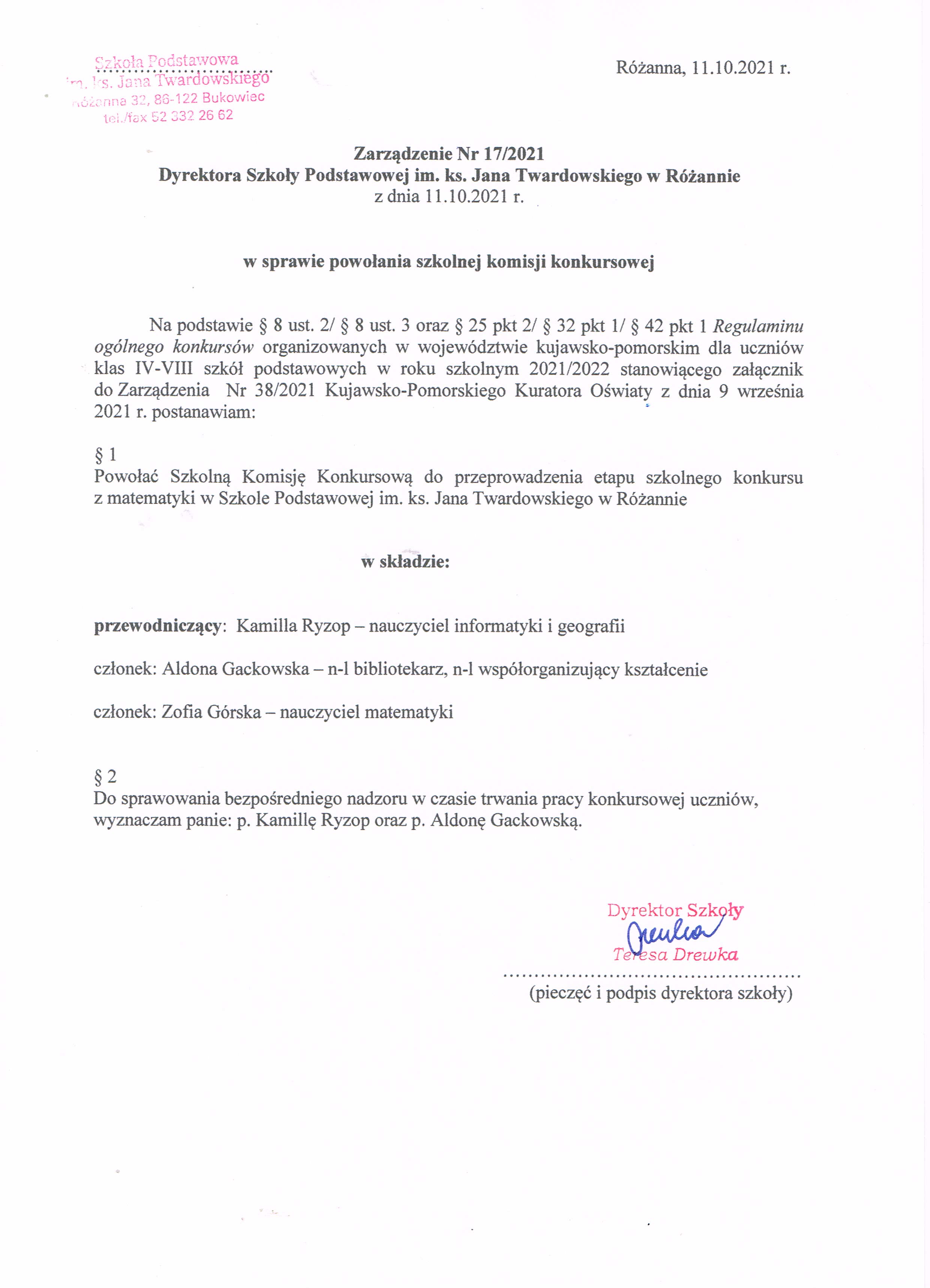 | utworzono: | data: 11:11, 15.10.2021 | przez: Kamilla Ryzop | Zarządzenie nr 17/2021 Szkoły Podstawowej w Różannie w sprawie powołania komisji konkursowej |