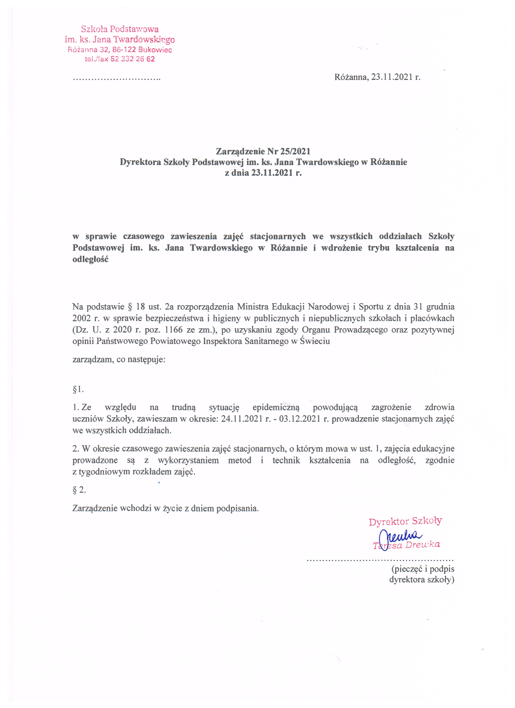 | utworzono: | data: 11:06, 26.11.2021 | przez: Kamilla Ryzop | Zarządzenie nr 25/2021 Dyrektora Szkoły Podstawowej w Różannie w sprawie czasowego zawieszenia zajęć stacjonarnych dla wszystkich oddziałów szkoły |
